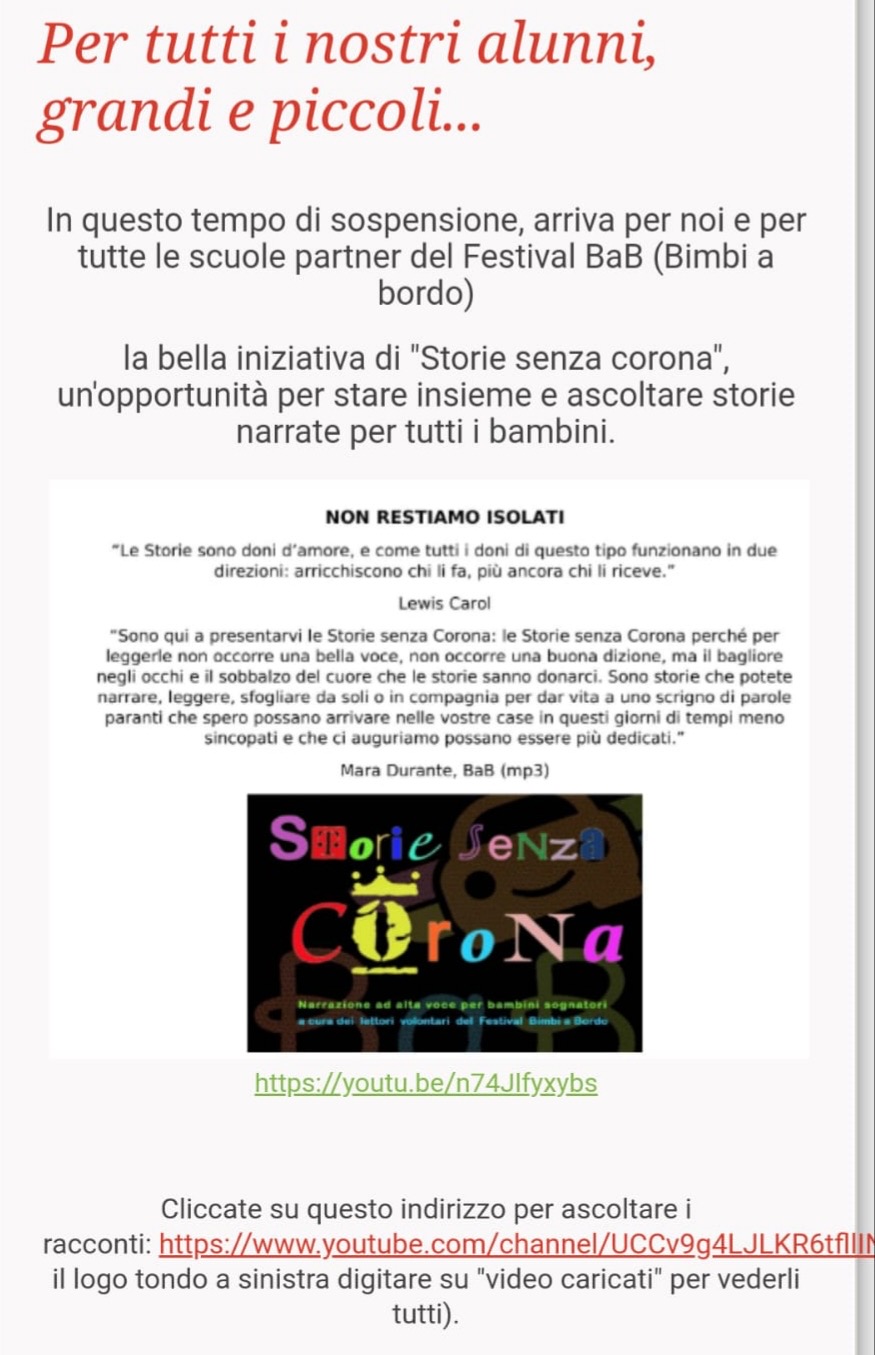 Grazie all'impegno profuso da genitori, nonni e bambini è partito il progetto "STORIE SENZA CORONA", un ponte di narrazioni e letture affinché i nostri ragazzi non si sentano soli, ma dentro il grande mondo della letteratura e delle storie. Per consentire a tutti di usufruire di tanta bellezza Vi invitiamo a promuovere la partecipazione, per uno scambio ed una condivisione. Partecipare è semplicissimo: